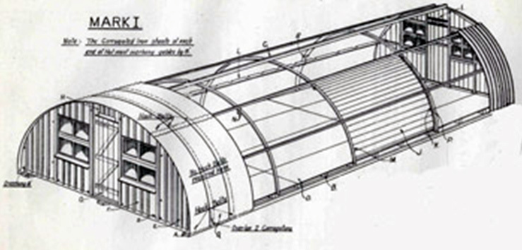 Below we can see a diagram of a typical Nissen hut used extensively during this period due to its simple and quick construction using a simple wood frame covered in corrigated iron. These can be found at airfields and army camps as barracks as well as many other uses.