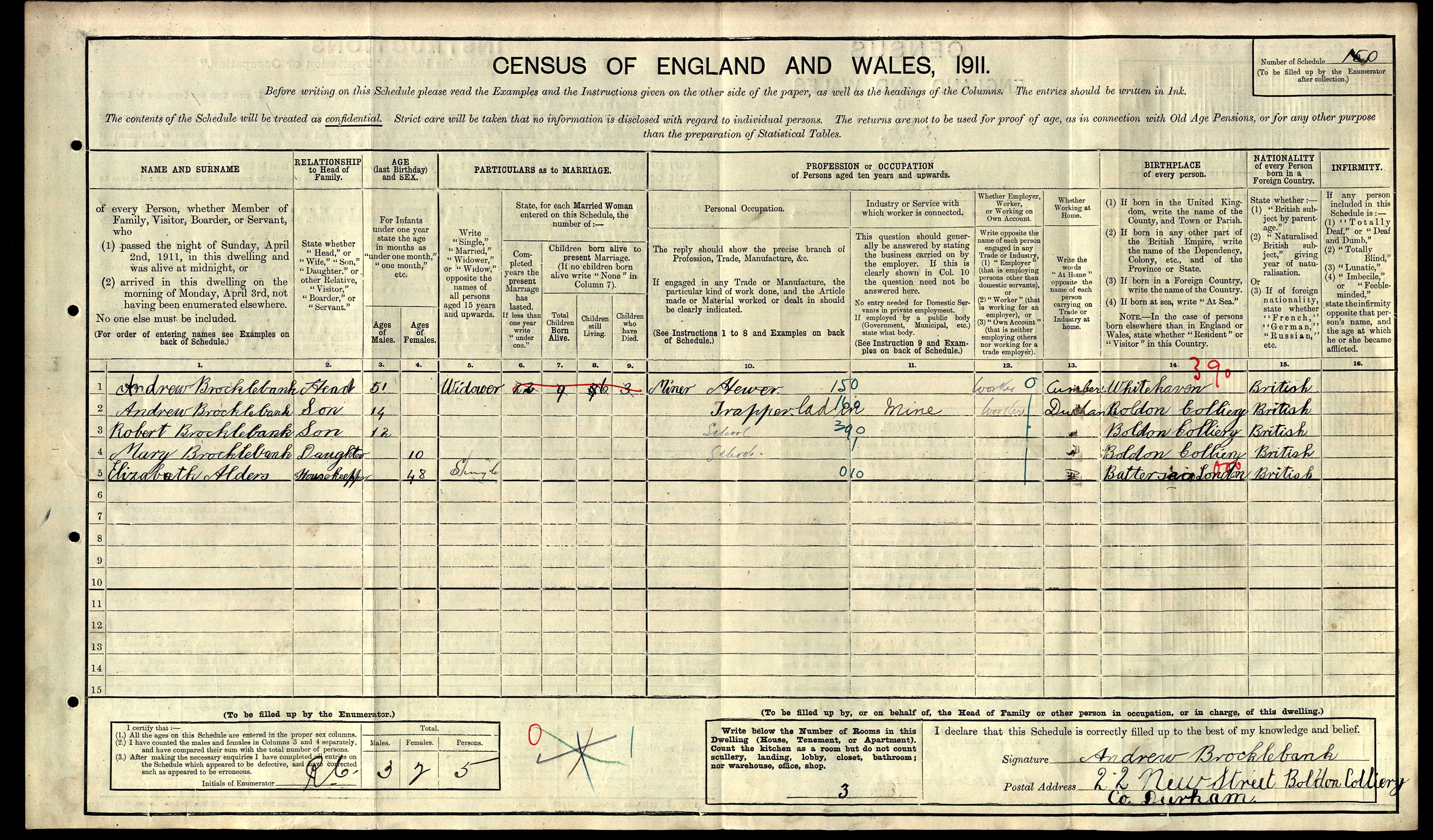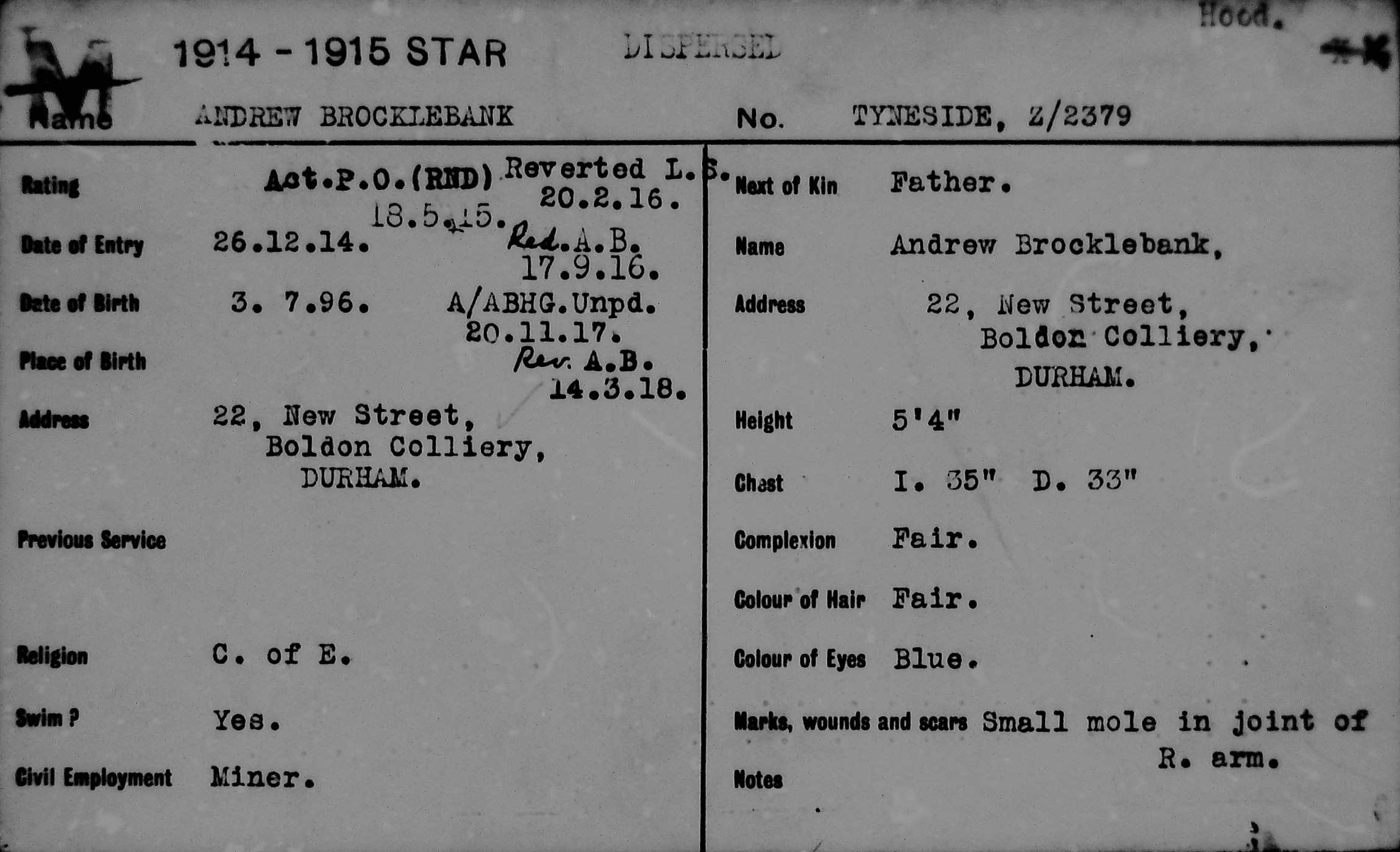 Story | Andrew Son of Andrew Brocklebank b1860 and Annie b1869 with sisters Margaret b1890 Lilian b1894 Mary b1901 and brother Robert b1899 was born in Boldon Colliery. His father was employed as a Coal Hewer at the pit whom he later followed as a Trapper lad aged 14 on the 1911 Census by which time his mother had died.