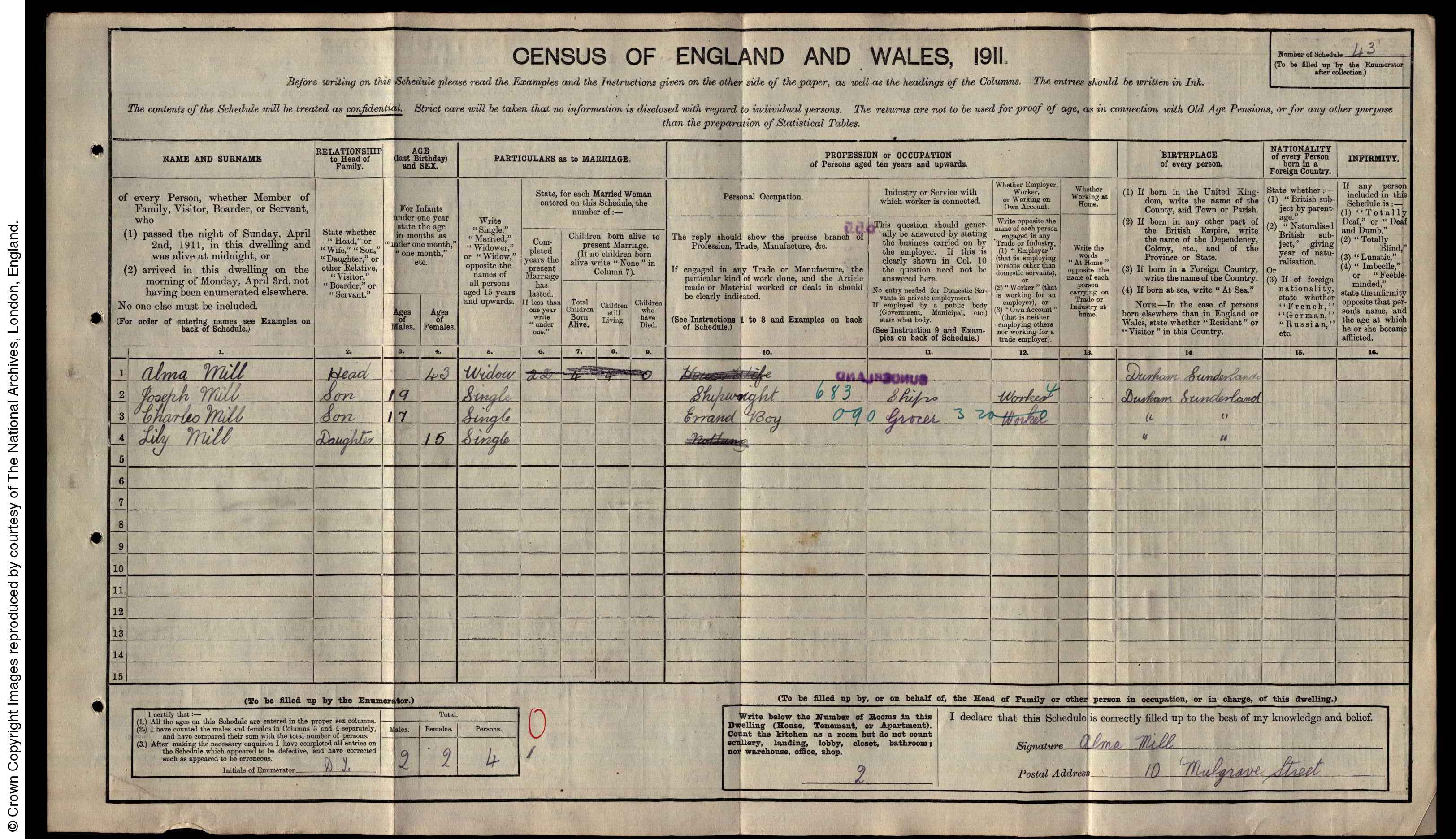 Story | Charles was born in Sunderland to mother Alma Mill b1863 on the 1911 census she was down as a widow at only 43. She also had a son Joseph Mill b1892 a shipwright, Charles at the time 17 was a Grocers errand boy and a sister Lily b1896 was unemployed. They lived at 10 Mulgrove Street which was on the North Side of the river in the area that is now next to the glass center. On the absent voters list in 1918 he was living in East Boldon and serving on the Colossuss as a stoker. Charles married in 1922 in Sunderland to a Hannah Nelson b25/5/1900. On the 1939 census Charles was now a public house manager at the Crispin Inn Church Street in Chesterfield living with his wife, no children listed.