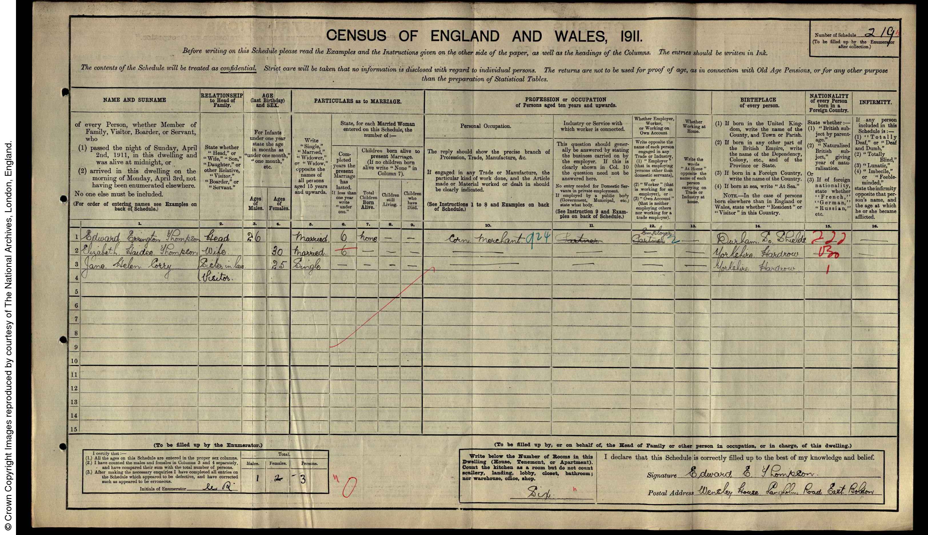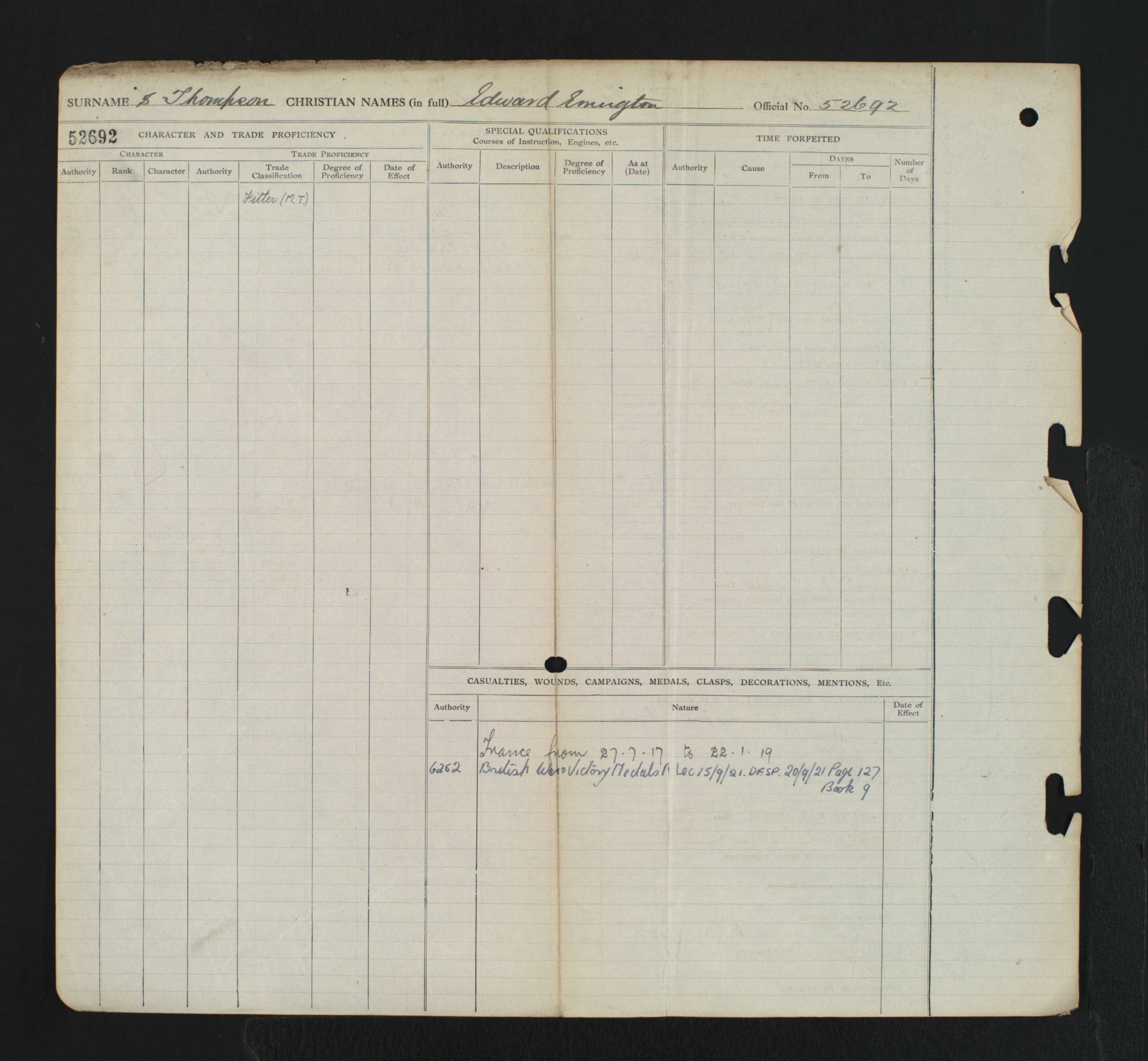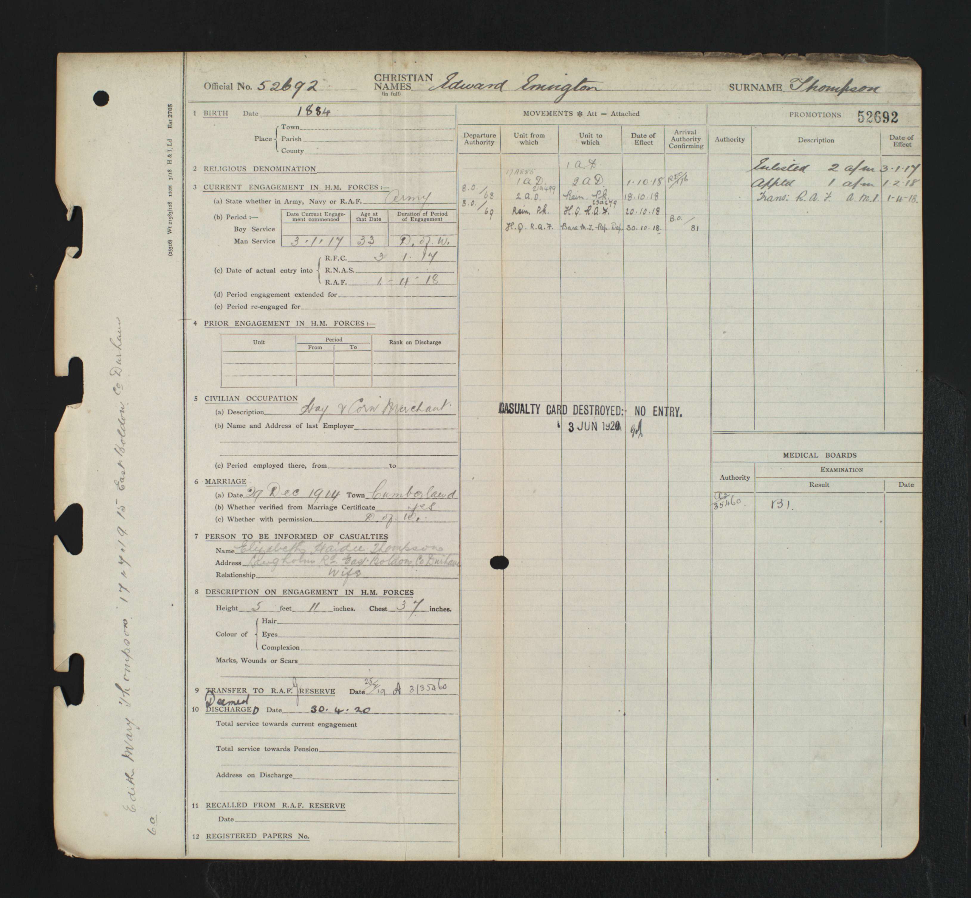 Story | Edward prior to the war was a Hay and Corn Merchant married to Elizabeth Haidee Thompson b1880 on the 1911 Census. Edward Enlisted in the Army originally on the 3/1/17 age 33 and later transfered to the RAF on 1/4/1918 until 1920 when he returned to civilian life. By 1939 he had moved to 18 Malborough Road Bradford, and his listed employment was down as ARP full time.