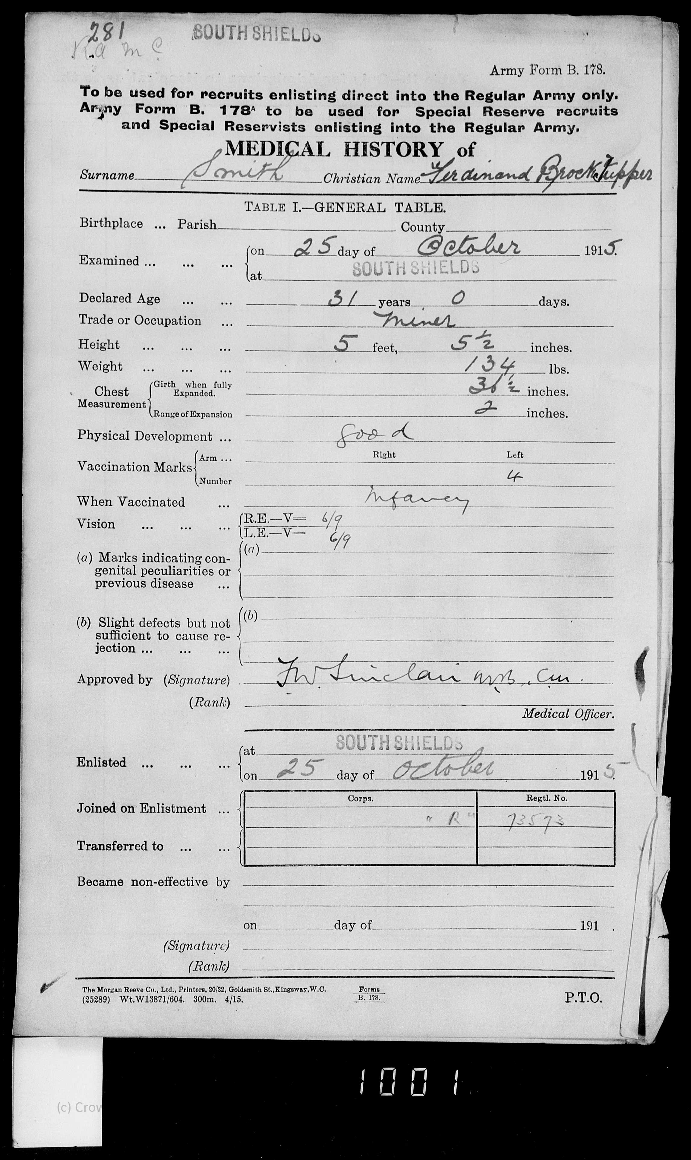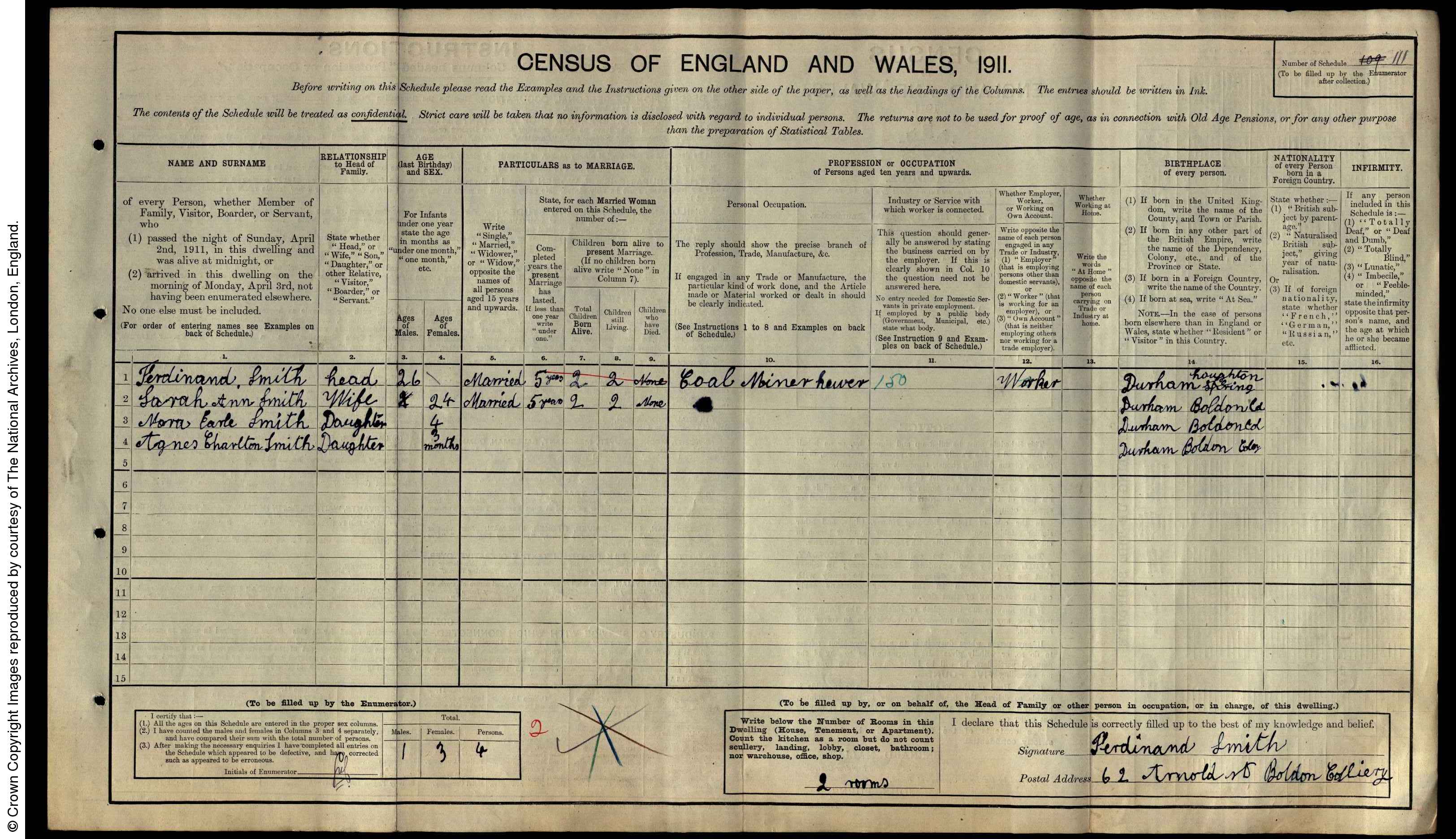 Story | Ferdiand on the 1901 Census was living with his parents in Hebburn. Father Frederick Smith b1862, mother Agnes b1865, brothers Thomas b 1882, Frederick b1891 , Arthur b1892 and sisters Rachael b1886, Agnes b1896, Ada b1899. Ferdinand worked with his father and elder brother in the local pit. By 1911 Ferdinand now 26 was married to Sarah Ann Smith b1886 with Daughters Nora Earle Smith b1907 and Agnes Charlton Smith b1911, he was working in Boldon pit as a "Coal Hewer" and lived at 62 Arnold street.
