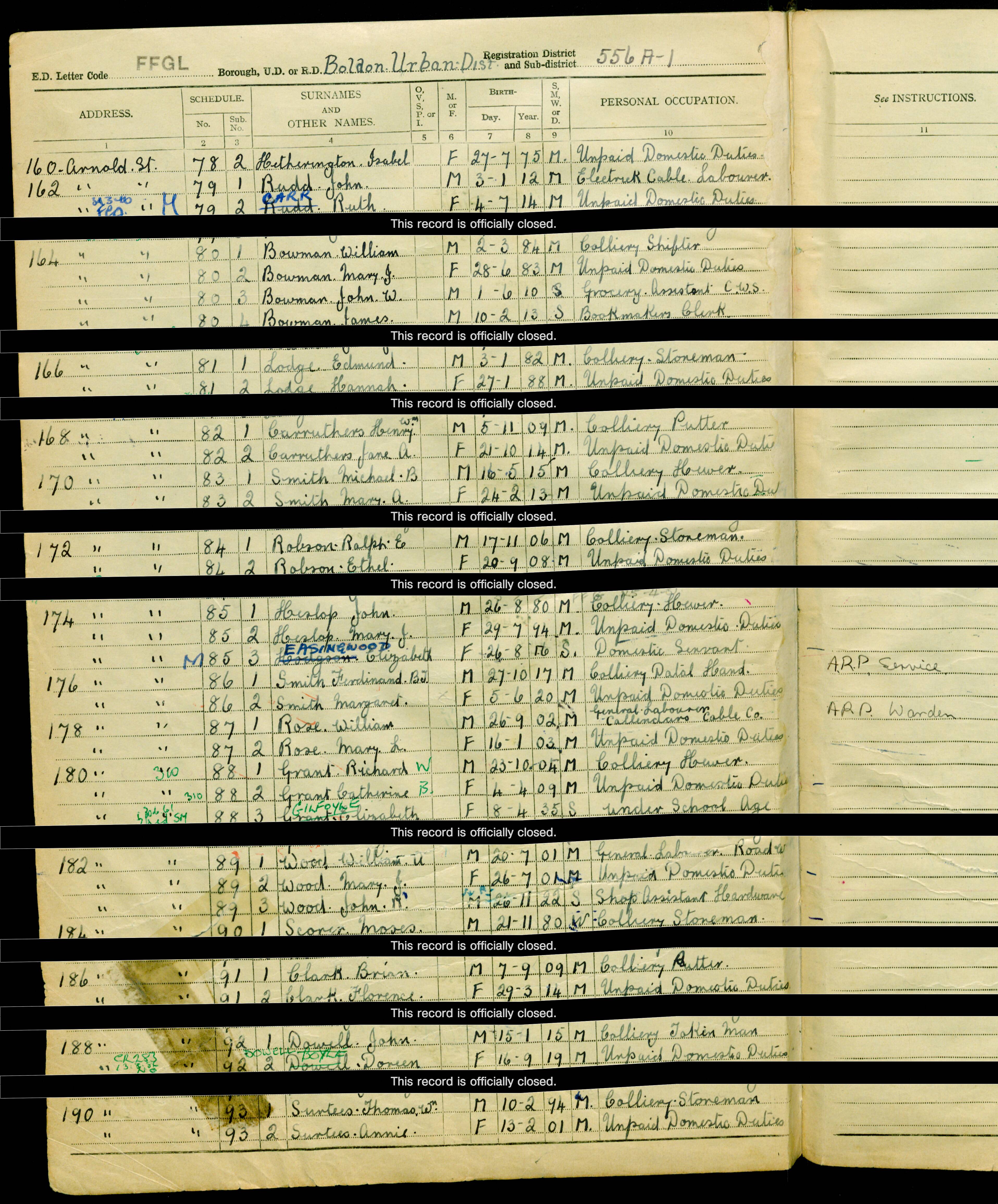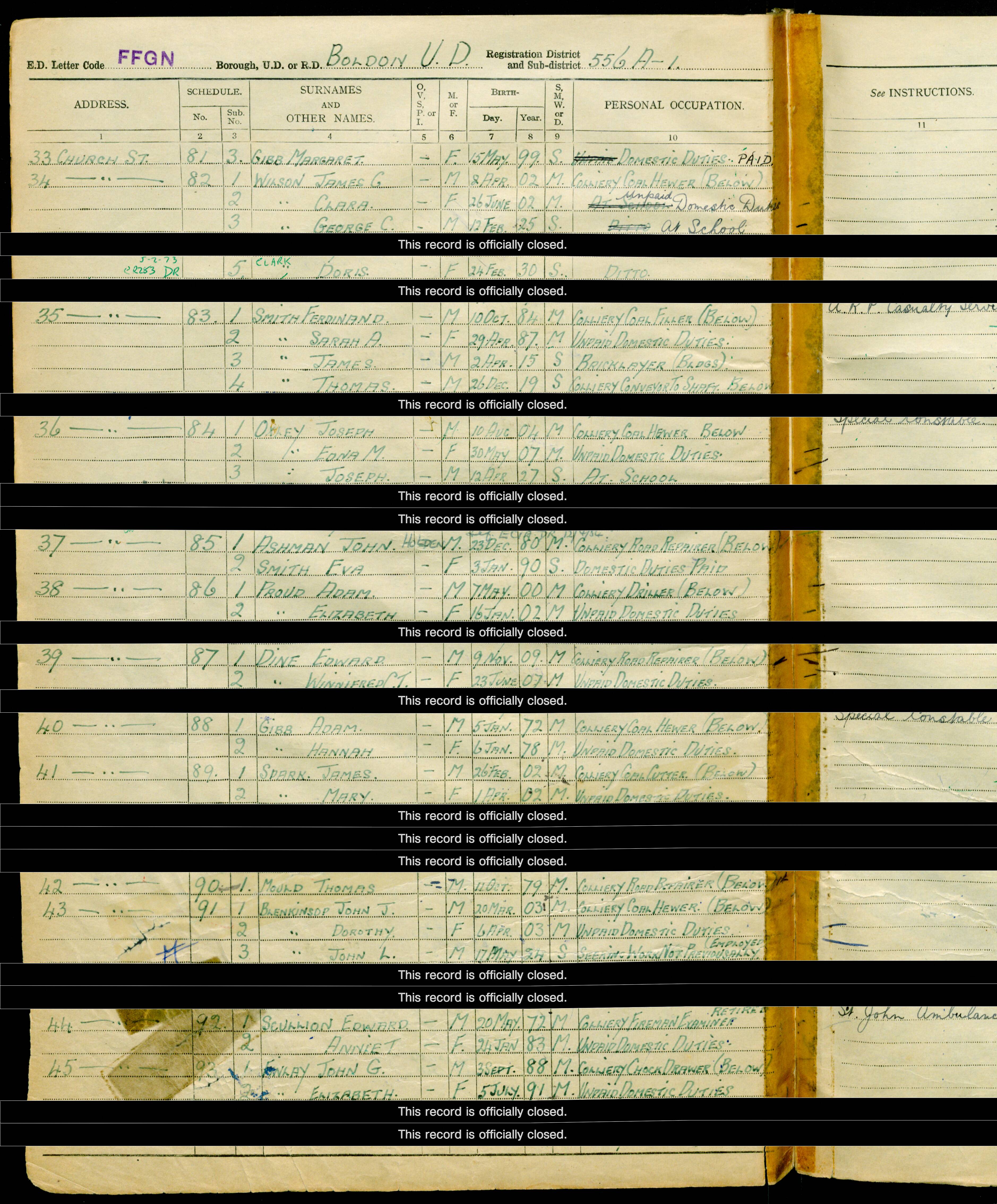 After serving in the Royal Army Medical Core during the war he was discharged on 2/3/19 according to his medical records. In 1939 during the commencement of the 2nd World War Ferdinand living in 35 Chruch Street was back working down the pit as a "Colliery Coal Filler" and had two sons living with him, James a "Bricklayer" b2/4/15 and Thomas b26/12/19 "Colliery Converyor to Shaft". After work he was in the ARP in the Casualty Service likely due to has past experience in the RAMC. He also had a Son Ferdinand BJ Smith b27/10/17 who lived in 176 Arnold street and also work down the pit, he was married with wife Margaret b5/6/20 and like his father he also was in the ARP service.