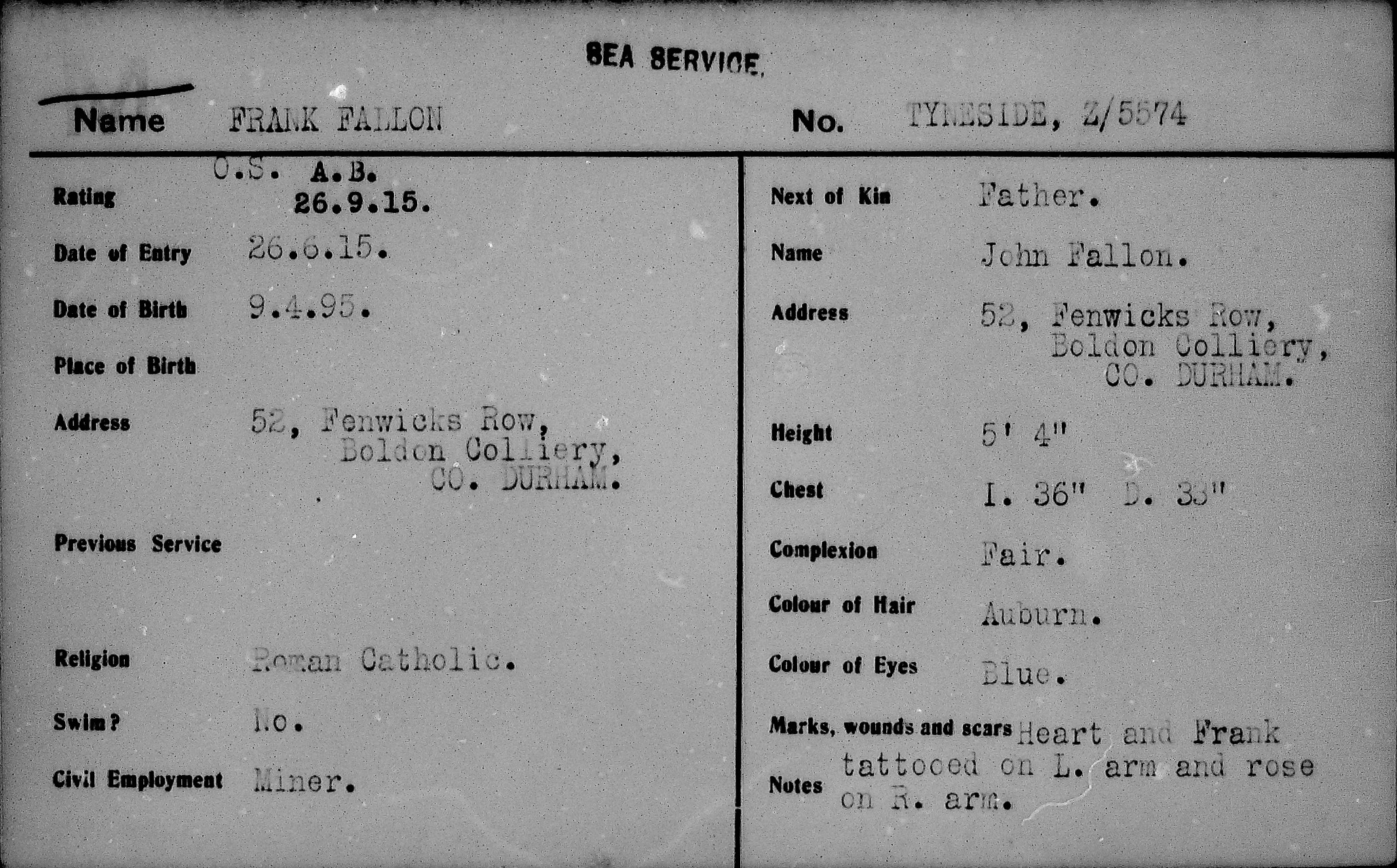 Story | Frank Fallon was a miner beofre the war Like his father John Fallon b1859, His mother Annie b1860 was living in 52 Fenwicks Row Boldon Colliery with a very large family with Frank having 17 brothers and 3 Sisters. One of his brothers Michael b1881, died in Boldon pit in 1908. Many of his other brothers who were of age also worked in the pit as can be seen on the 1901 census.