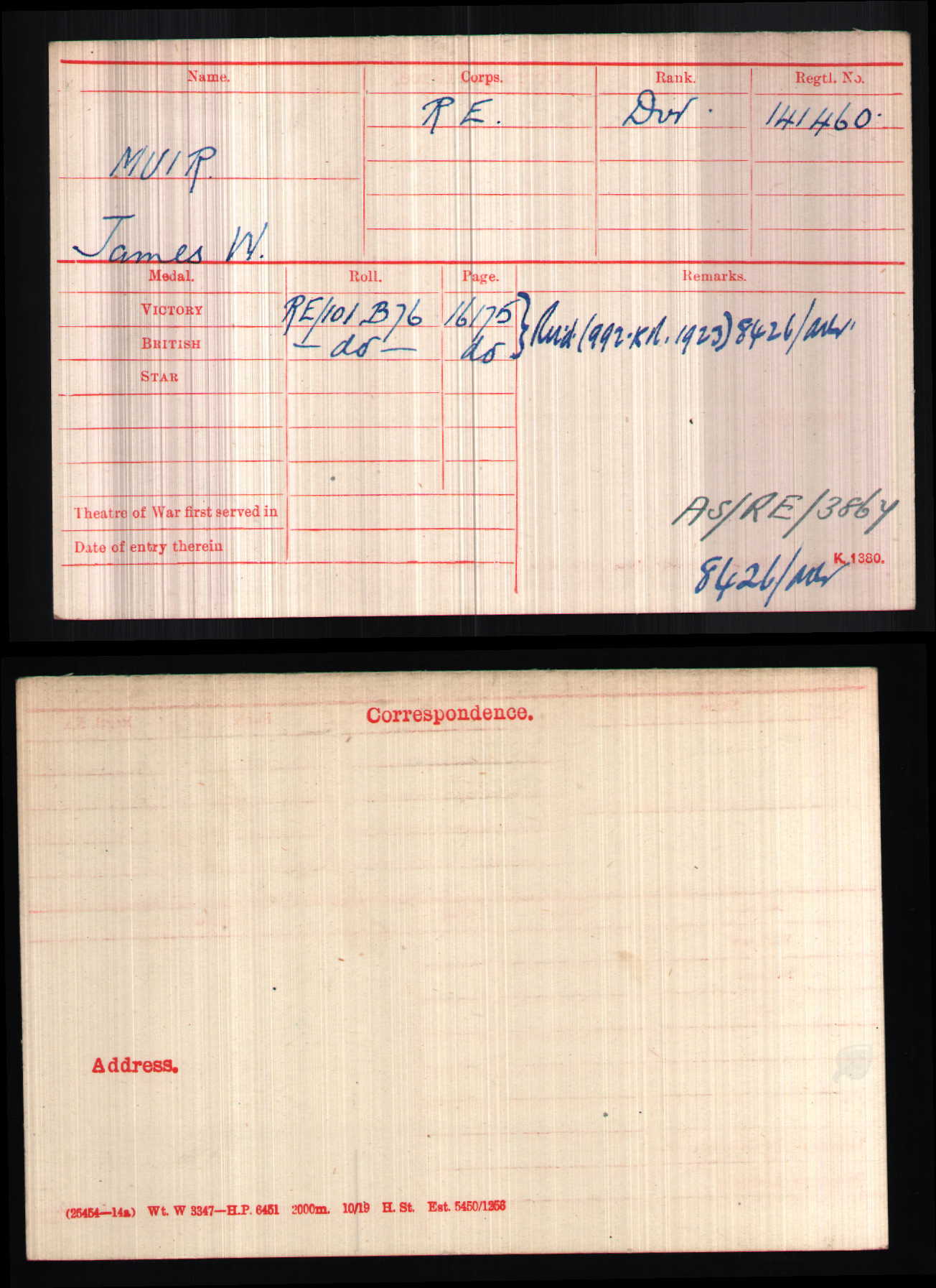 Story | James pre war worked on various farms as a land worker or for private houses as a Gardner. Married to Annie Johnston Clark, With Sons James, John, Edwin, stephen and Norman and daughters Agnes, Violet, Susannah, Olive, Edna. Due to his job he moved around a lot, having been born in the Allison Arms East Jarrow (his father a gardner at the time at Bilton Hall Simonside). He lived a number of years in Redcar Terrace, The newly built new Road house, St Nicholas View as well as Bridle path. He served in the Royal Engineers Survey Company as a Driver. In the 1st World war this was a title often given to men who handled the horses that were used to pull heavy machinery or big guns, which makes sense due to his many years working on a farm, he would have plenty of experience working with horses.He was awarded the British Medal and the Victory Medal for his service. Shortly before the 2nd World War he moved to the Scotswood area of Newcastle, where upon at the start of WW2 the younger children were evacuated to Haltwistle. The older children had already moved away to Knaresborough before joining the services themselves, he too would take the remaining members of the family to Knaresborough where he worked as a labourer for the local council. He died in 1961 the year after his wife Annie, the job on his death certificate was Air Ministry Messenger. His Brothers also of Redcar Terrace later Addison road also served in the war, Andrew Morgan Muir (Army), Edwin Muir (Army) and Joseph Muir (Navy).