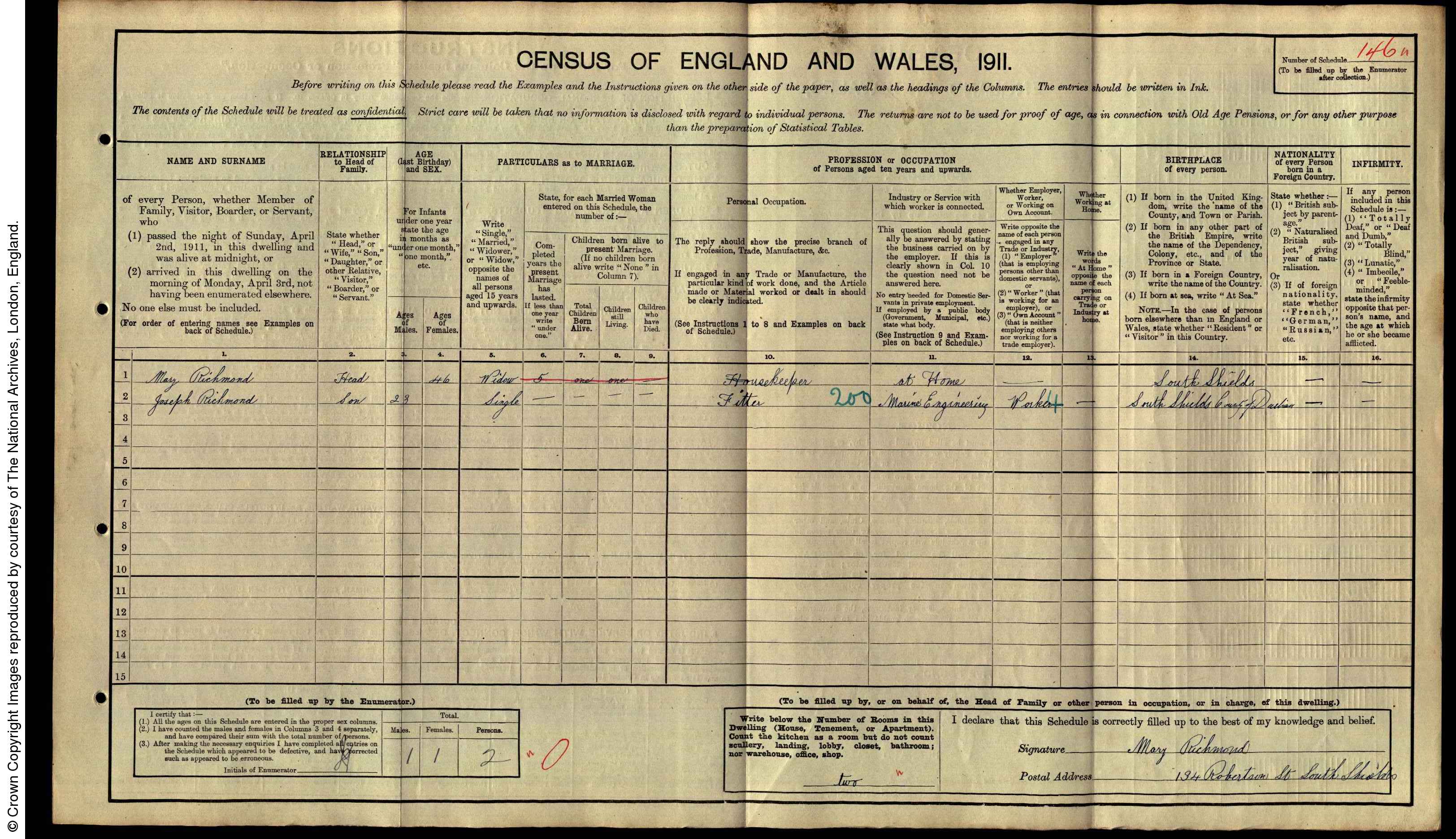 Story | Joseph age 3 on the 1891 census was living in 132 Robertson Street Westoe South shields with father Joseph b1862 a Printer and mother Mary Elizabeth Richmond b1866. By 1901 Joseph's father had died and Mary was working as a shop keeper and joseph aged 13 her assistant. Forward another 10 years to 1911 and Mary still a Widow is now a housekeeper to her son who is a Marine engineering fitter.During the war Joseph was married and living in East View Boldon Colliery, he was serving in the Navy and held the rank of Sub Leuitenant. On the electrol role of 1918 Joseph was serving on the HMS Island Prince a Grimsby Type Trawler that had been commandeered for the war effort as a mine sweeper possibly based on the Tyne.