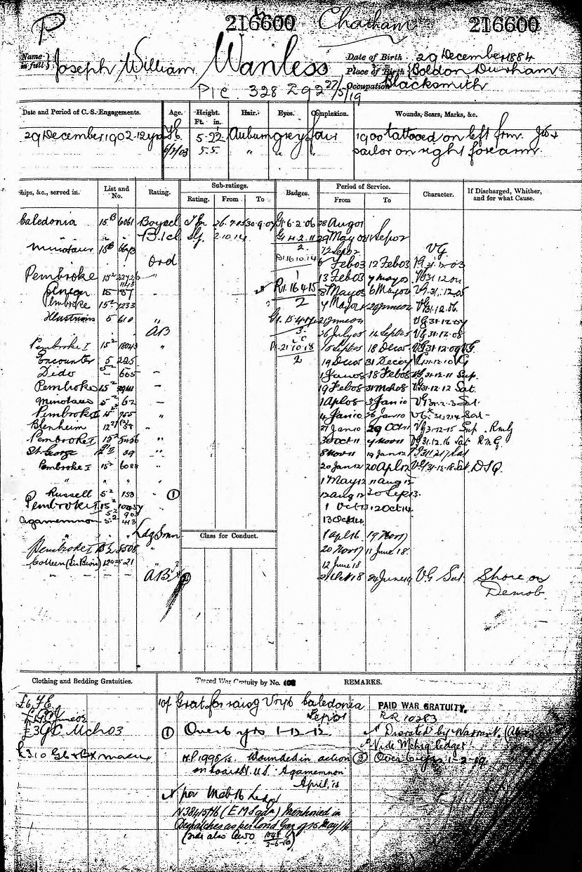 Story | Joseph served on a number of ships as can be seen in his service record, note Pembroke like the Victory 1 were shore based Facilities where sailers were located between ships. |