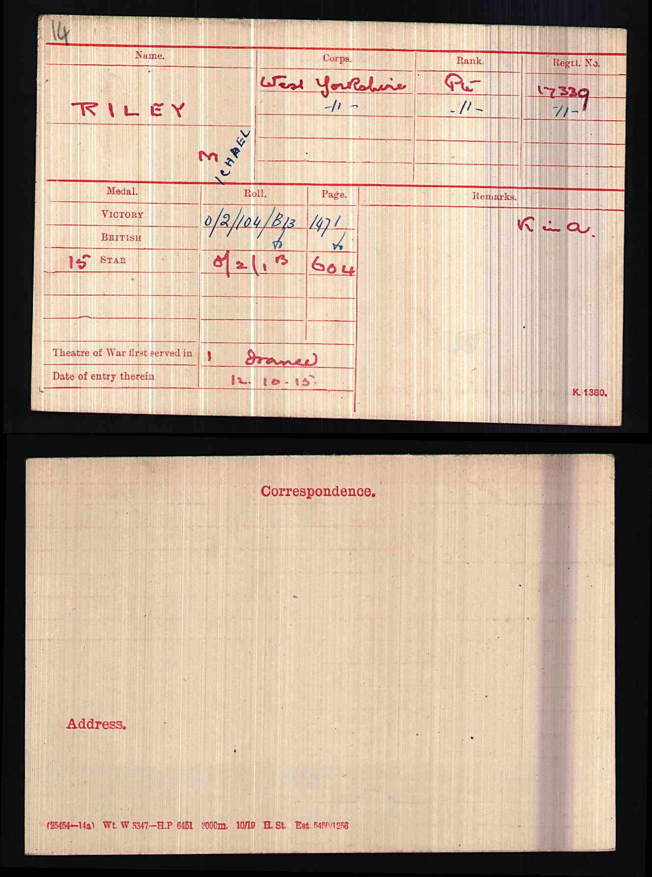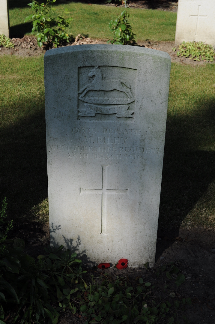 Story | Michael Joined the East Yorkshire regiment, but later ended up in the Prince of Wales’s Own(West Yorkshire Regiment) 12th Bn. He was killed on 28th March 1916, along with other members of the regiment, including the officer commanding. I understand from the action at the time that they were killed by a German sniper. Buried in the Elzenwalle Brasserie Cemetery, in Belgium