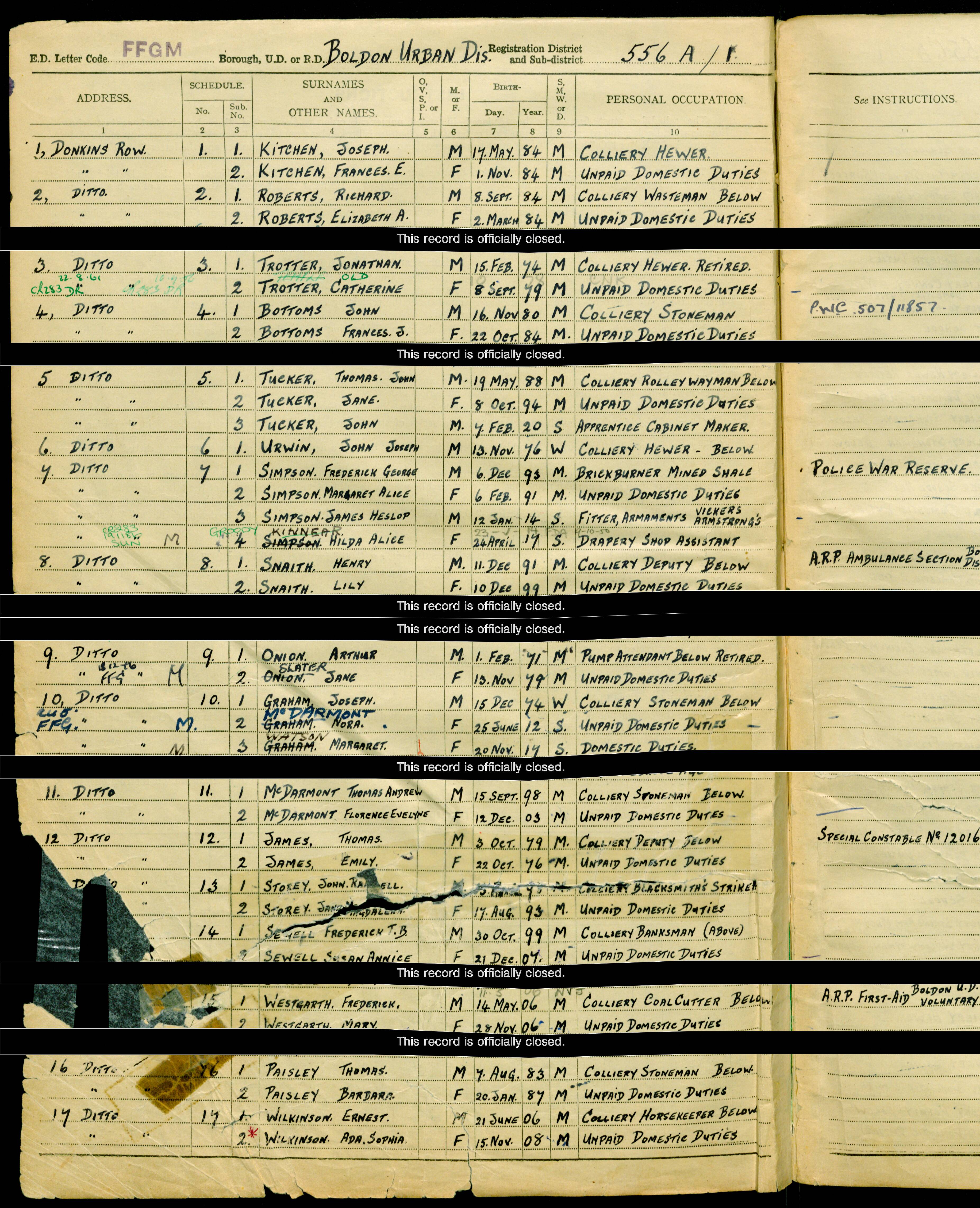 | Story | Thomas prior to the war was a Claol hewer at Boldon pit, living with his brother in Law at 9 Rosebury Terrace Boldon Colliery as on the 1911 Census. It appears he was married to a Barbara Paisley b20/1/1887. they also have Robert Paisley b1902 who looks like a brother and since the head of the house is named Bowden then Elizabeth Bowden must be Thomas's Sister also. On the RAF Muster Roll it has Thomas down as being a Cook which suggests that he may have served in the army to start with then around many others on the 1/4/18 trasnfered over to the RAF where his rank was listed as Private. On the 1939 Register after leaving the RAF Thomas has returned to the pit as a Colliery Stoneman below ground.