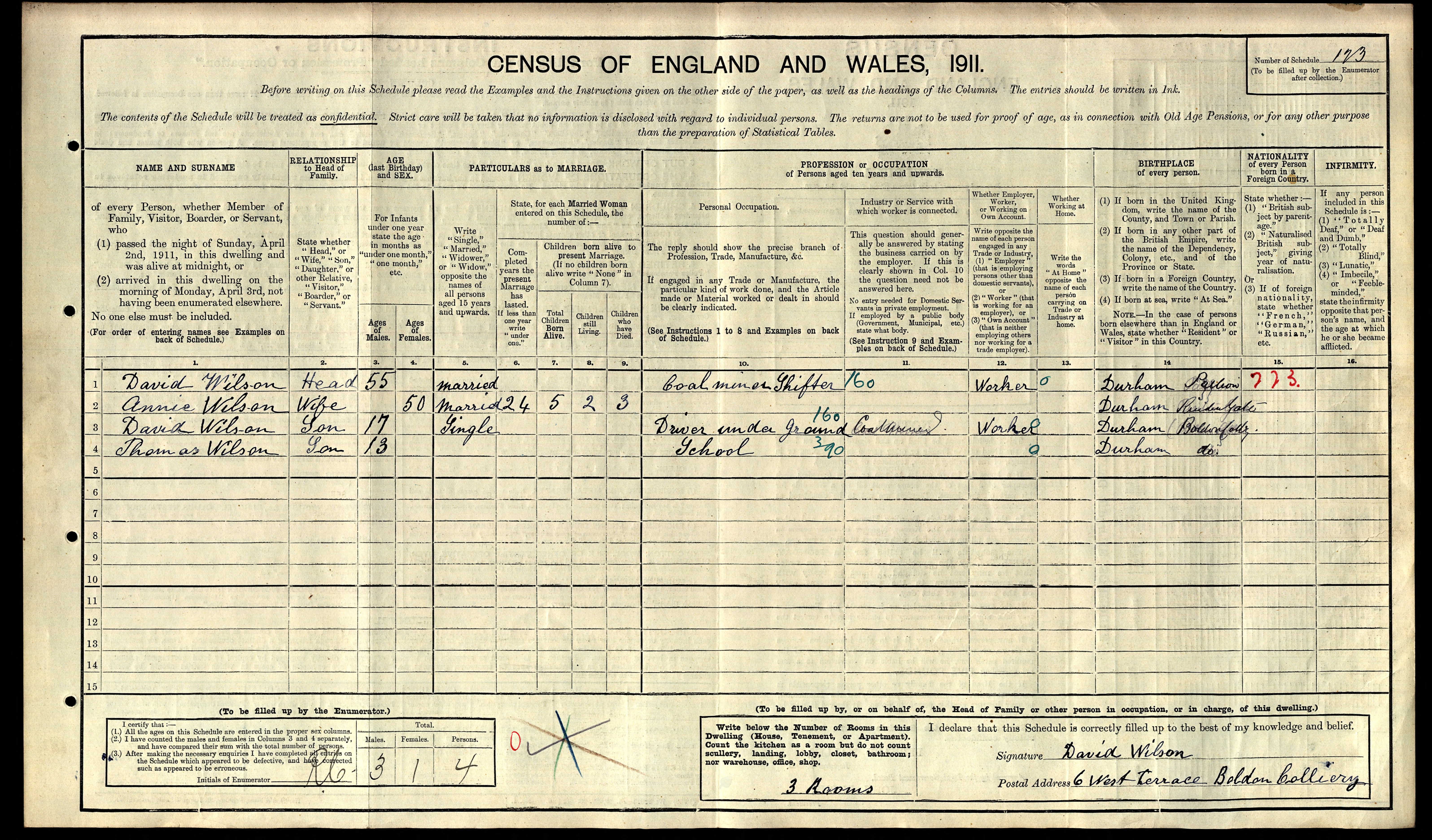 Story | Thomas son of David Wilson Coal Miner "Hewer" b1856 and mother Annie Wilson b1861, had brothers William b1881 a surafce labourer at pit, David Wilson b1894. They were living at 6 West Terrace Boldon Colliery. By 1911 Thomas then 13 was at school and his older brother David aged 17 was employed as a "Driver" underground" at the pit. Thomas served on the HMS Kildonan Castle in 1918, the service number allocated above was popular for those employed as Stokers, this was a common job given to people previously employed down the pit. On the 1939 regsiter Thomas is listed as a Colliery Hewer, with marriage status Widower no children listed and living at 82 Arnold street