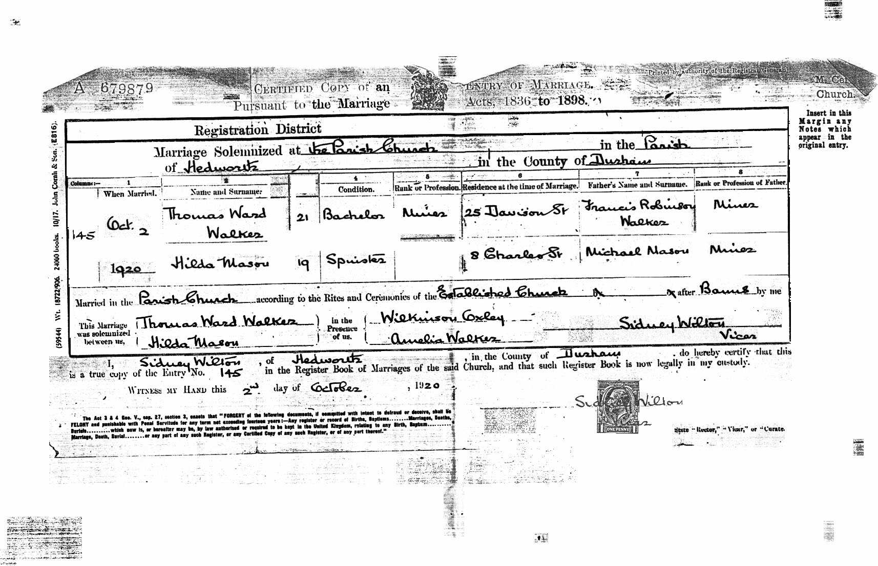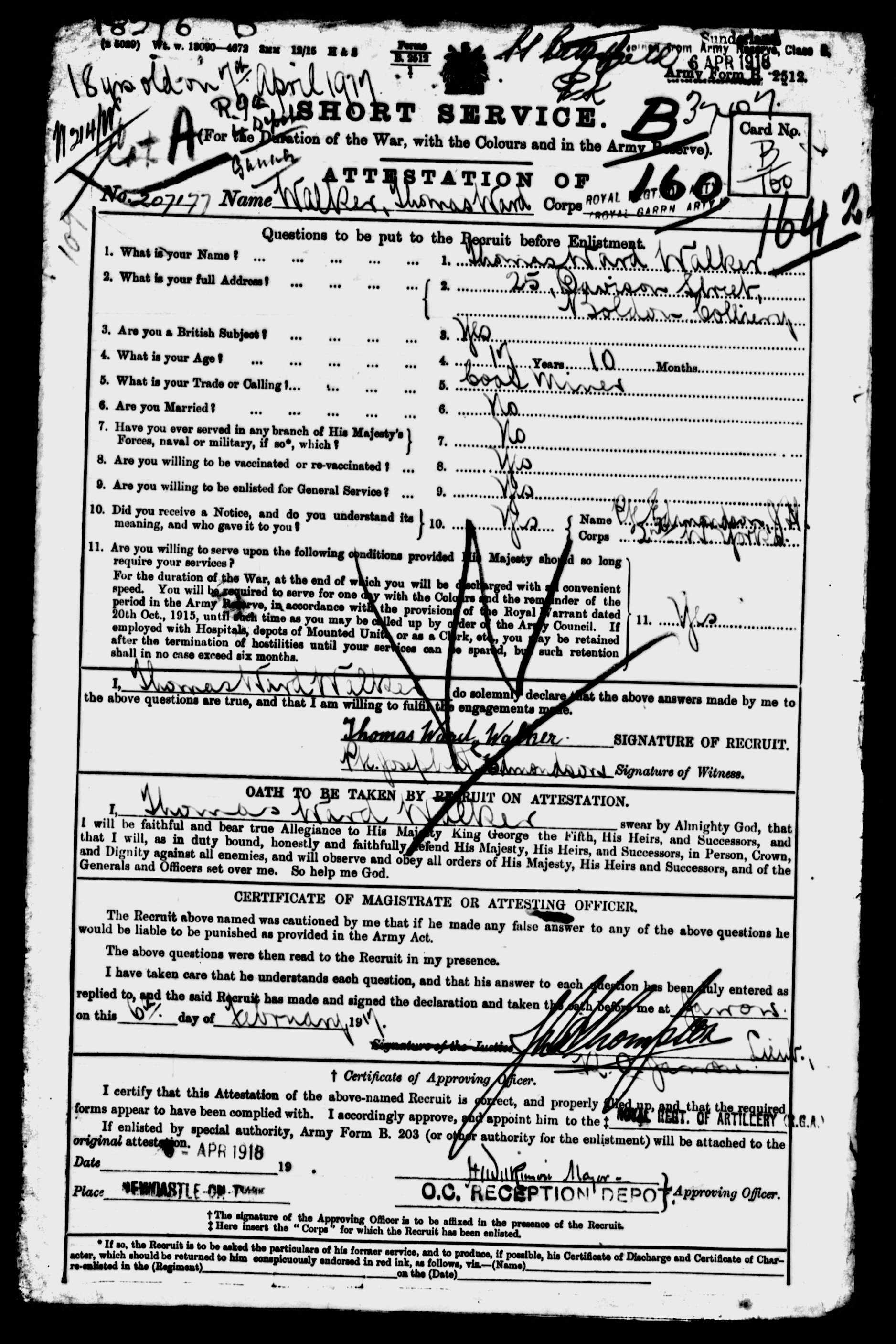Story | Thomas son of Francis Robnison Walker a miner also worked as a Coal Miner in Boldon Pit He enlisted on the 6th of February 1917 and served in the 4th Battery Royal Garrison Artillery. He married Hilda Mason b1901 from 8 charles street on the 2nd of October 1920.