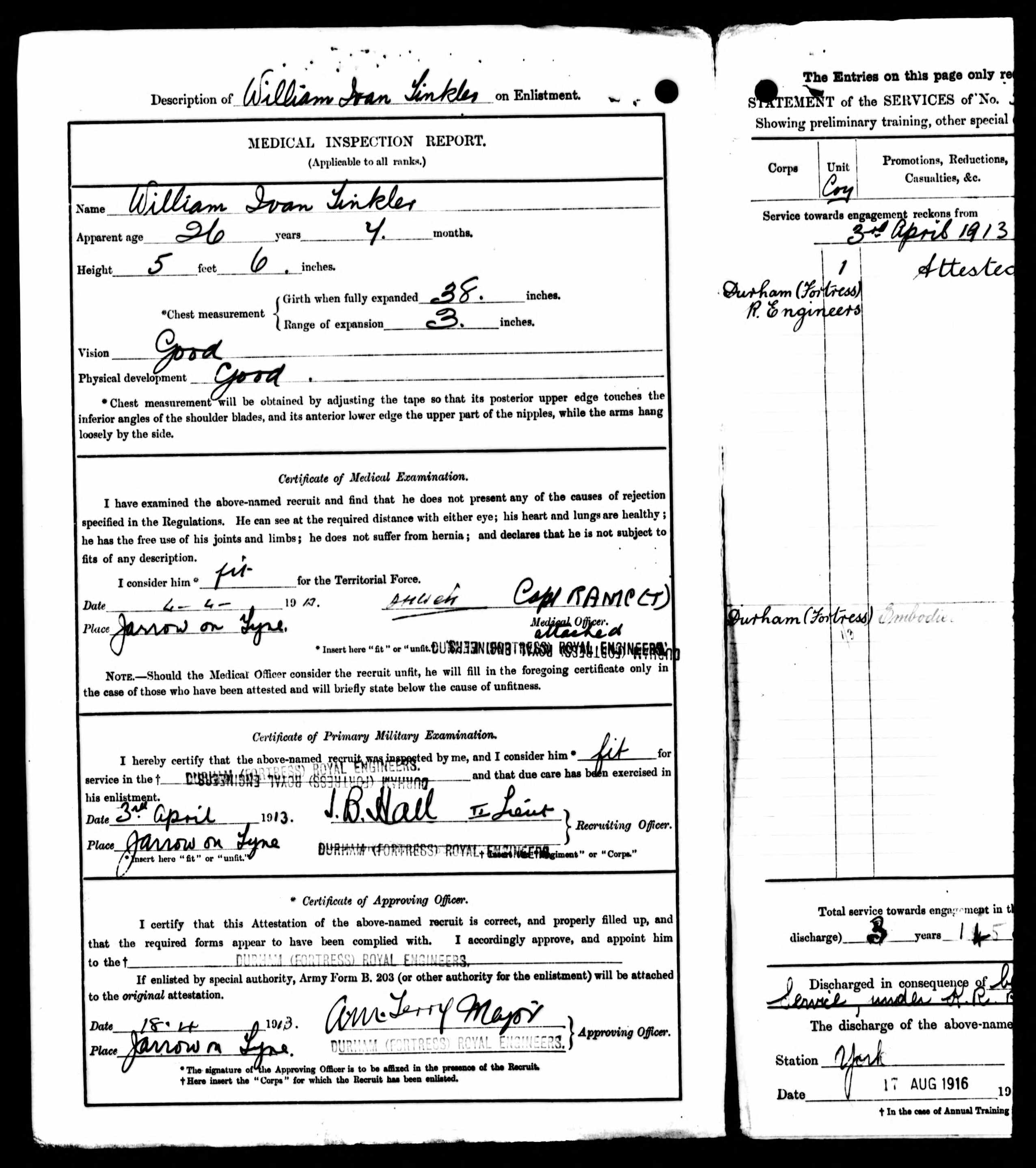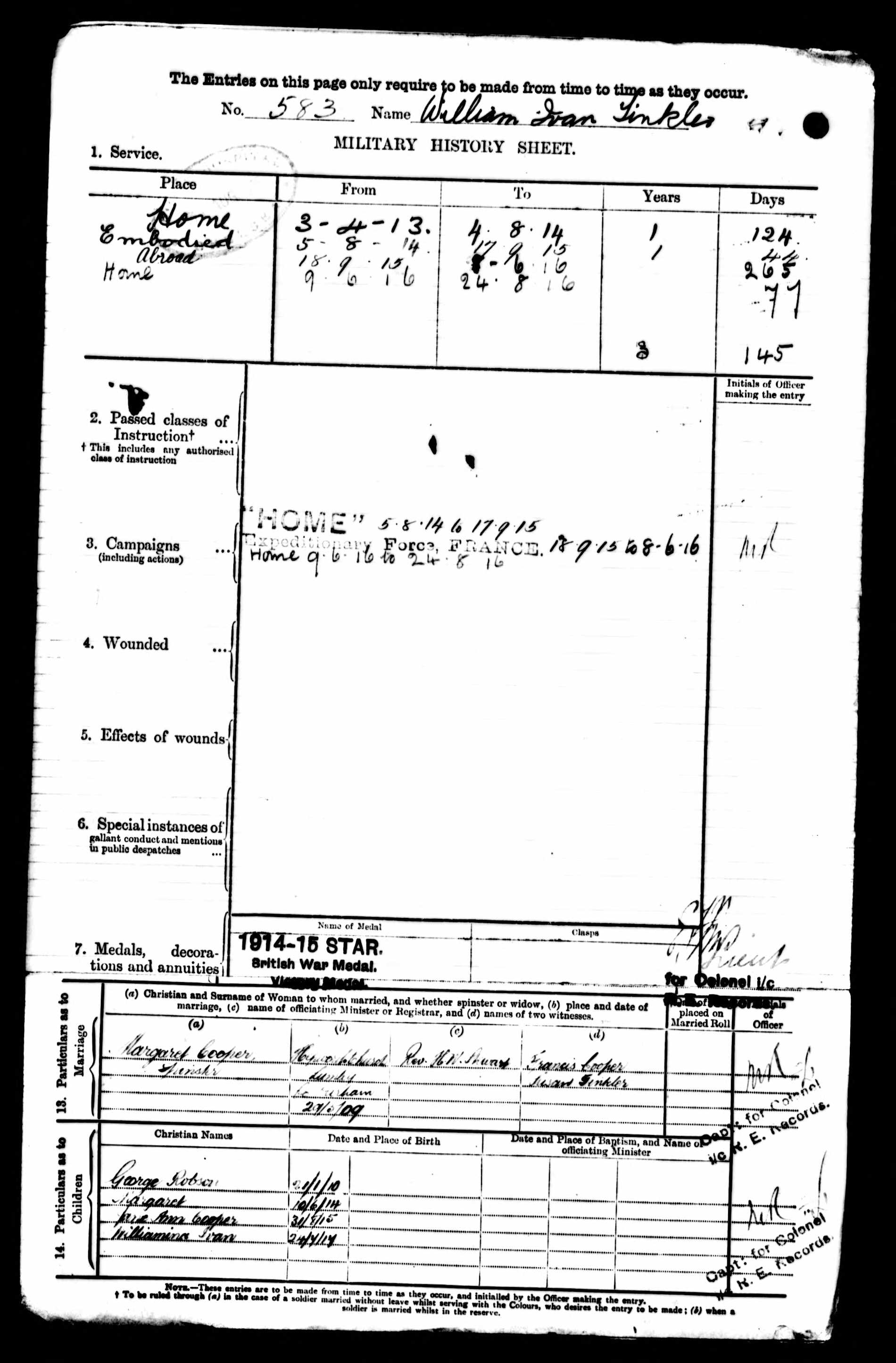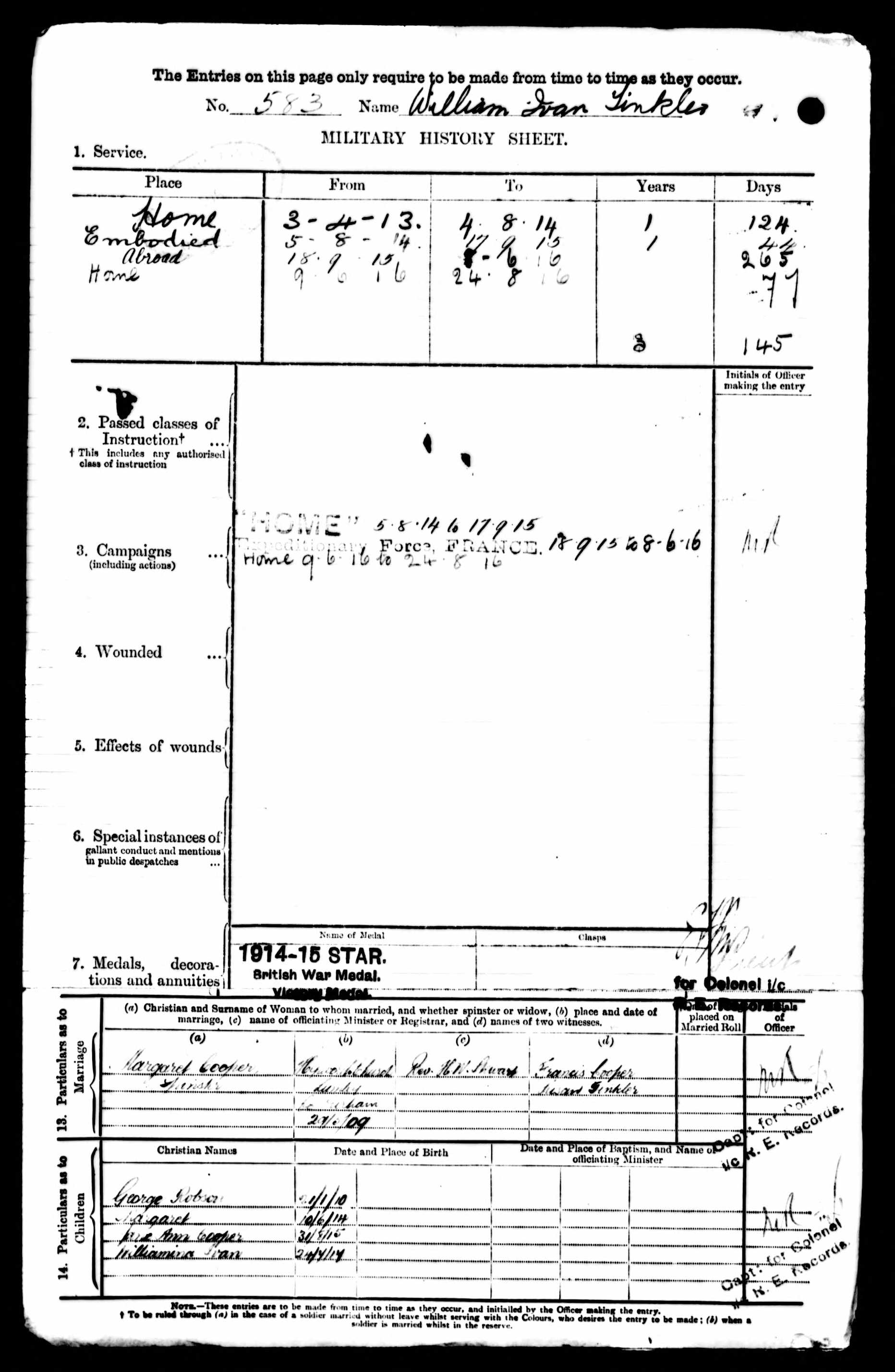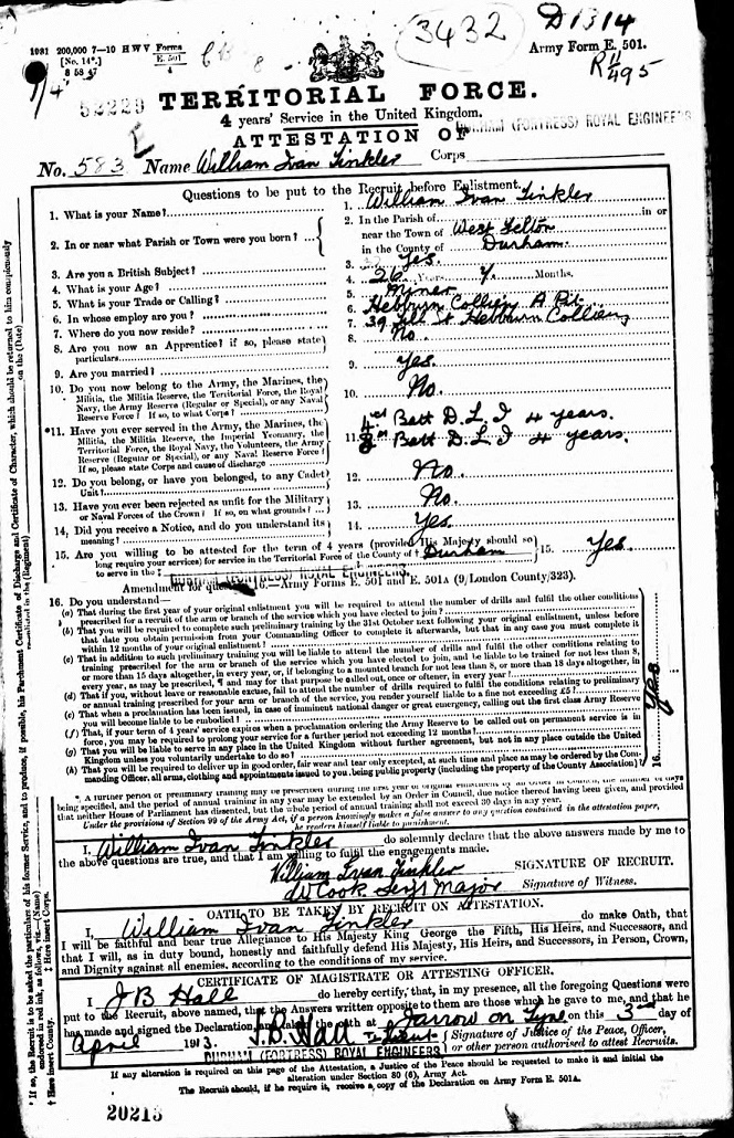 Story | William Born in West Felton Durham, he was occupied as a miner at Hebburn Colliery A Pit when enlisted, he was also down has having served 4 years 4th Battalion DLI and 4 years in the 8th Battalion DLI. He was awarded the 1914-15 STAR British War Medal. William Married to Margaret Cooper with children George Robson Tinkler, Margaret Tinkler, Jane Ann Cooper Tinkler and Williamina Ivan Tinkler.
