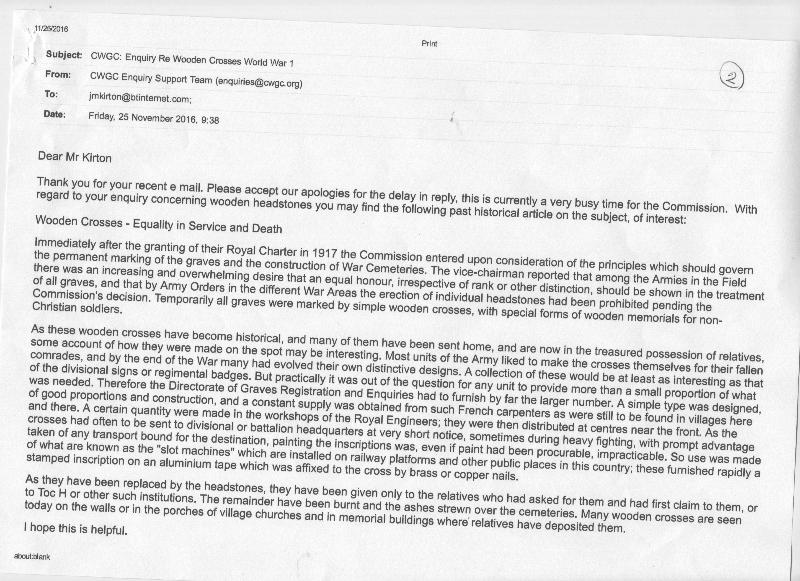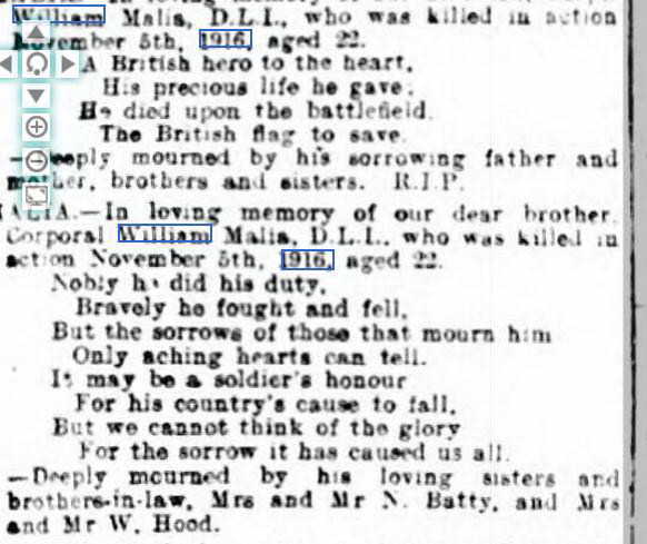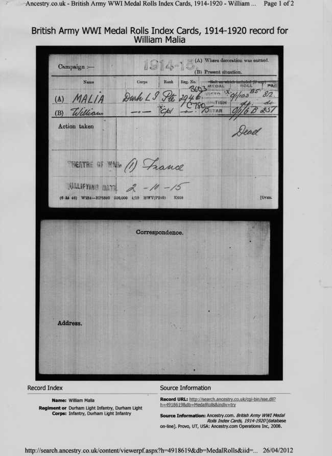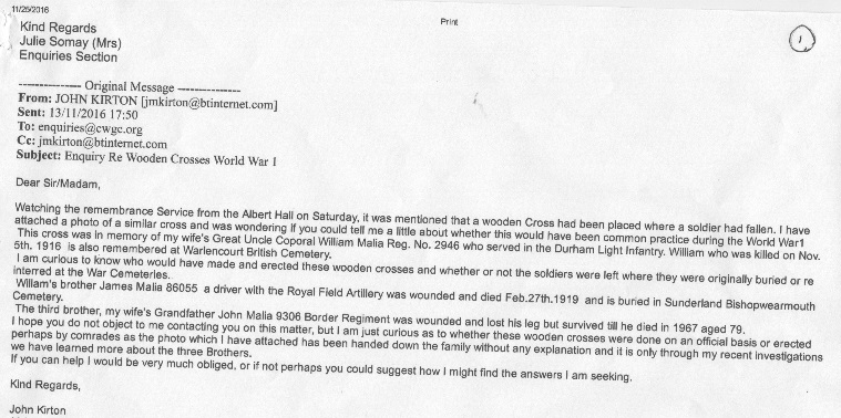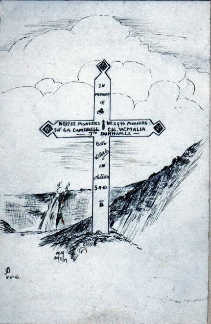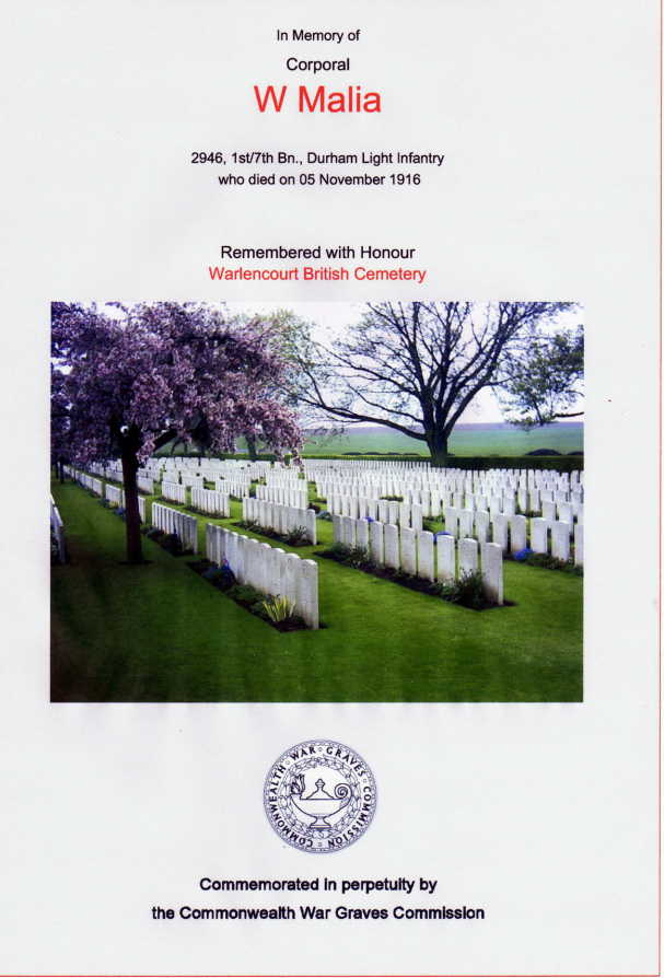 Story | William also fought in France in the first World War. He served in the 1st/7th Battalion Durham Light Infantry Reg. No. 2946. William was killed in action on Nov. 5th 1916 He is buried at Wallencourt War Graves Cemetery Flanders France. We don't have a photo of William but we do have a drawing of a wooden cross which marked where he was originally buried in France. I went on to ask if the fallen were left where originally buried or transferred to the War Cemeteries and Mrs Somay of CWGC replied that Corporal Malia original place of burial was due East of a village named Le Sars, which is South East of Warlencourt before he was reburied at Warlencourt British War Cemeterty