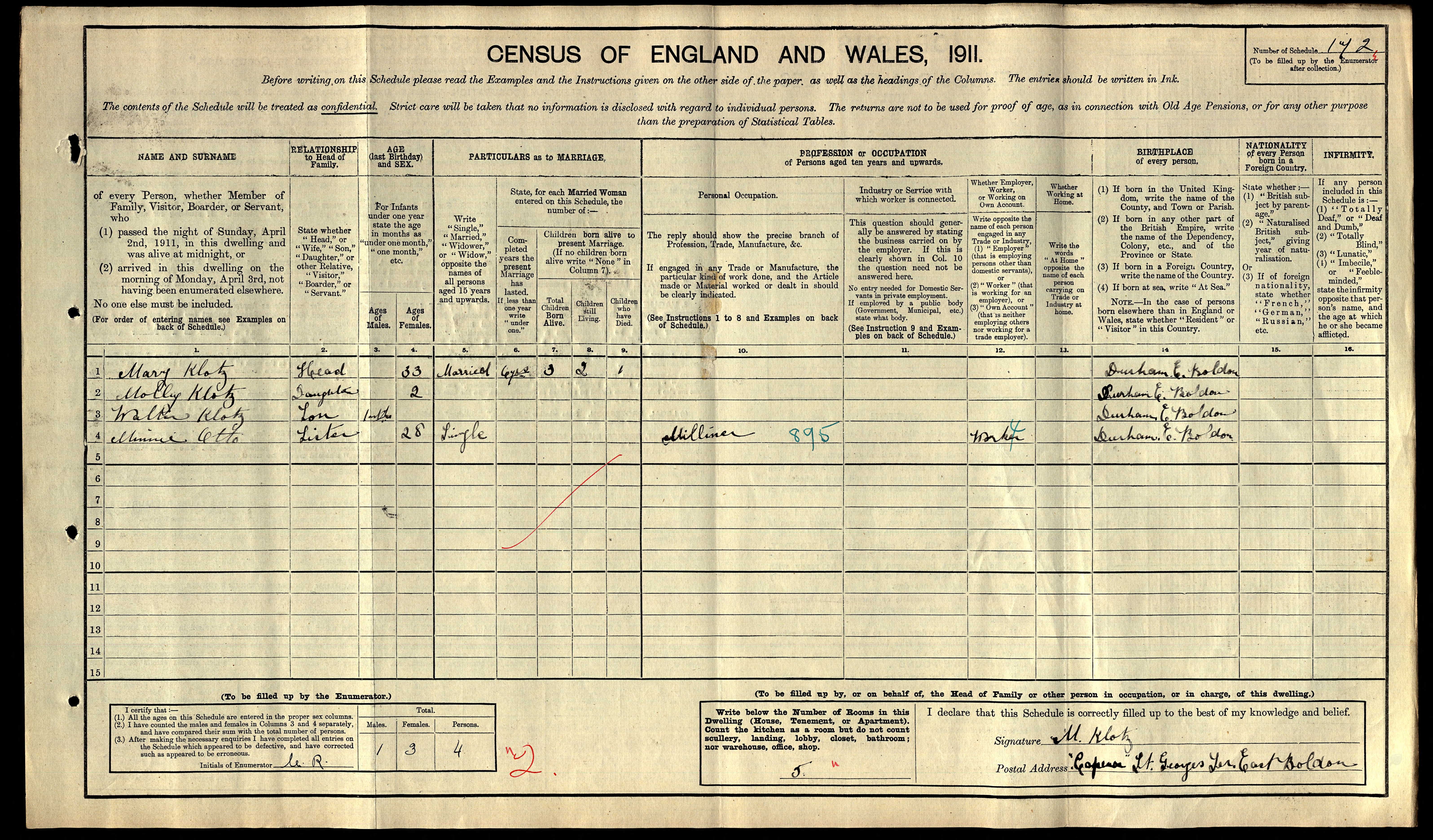 Story | When Walter Weisler Klotz was born on 16 July 1875 in North Shields, Northumberland, his father, Julius, was 29 and his mother, Mary, was 23. He married Mary Park Otto in April 1905 in South Shields, Durham. They had four children during their marriage. He died on 15 May 1918 at the age of 42, and was buried in Newquay, Cornwall.