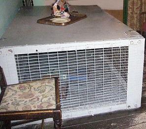 The Morrison Shelter on the right was designed to be used in the home where building of an outside shelter was not possible. It was a basic steel cage construction. As you can see from the picture it is not much bigger than a dog cage so must have been pretty unpleasant to be inside. The downside to this shelter wassif they house was damaged then the occuppants could be trapped inside the cage amongst the rubble. |
