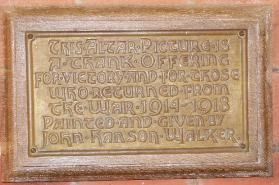 A painting dedicated to those who fought in WW1 donated by John Hanson Walker as indicated by the Wall plaque written in Art Nouveau style Relief. | |