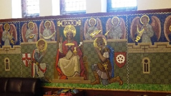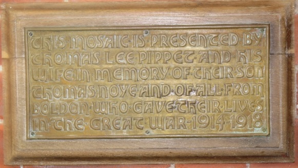 There is a mosaic running the length of the wall, in the centre is Christ in glory with the word “Pax” (peace) above his head. Kneeling to the left is Saint George, with the badge of England on shield. Kneeling to the right is a soldier with a badge bearing a wheel. This was dedicated by Thomas Lee Pippet and his wife in memory of their son Thomas Noye and of all from Boldon who gave their lives in the Great War 1914-1918 | |